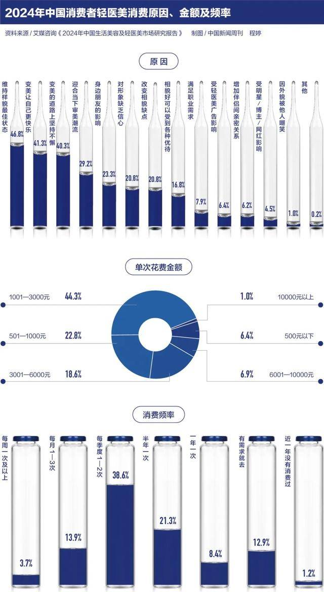 张雯尝试的项目属于轻医美。轻医美是一个商业化概念,通常指通过无创或微创手段改善容貌、延缓衰老。由于满足了人们“想变美又怕手术”的需求,这一赛道近年迅速崛起。嘉世咨询今年7月发布的《2025中国轻医美行业现状报告》预测,2025年中国轻医美市场规模有望突破2500亿元,并将以15%—20%的年增速持续扩张,成为全球最具增长潜力的市场之一。目前,轻医美项目已占医美市场的六成以上,且占比仍在提升。