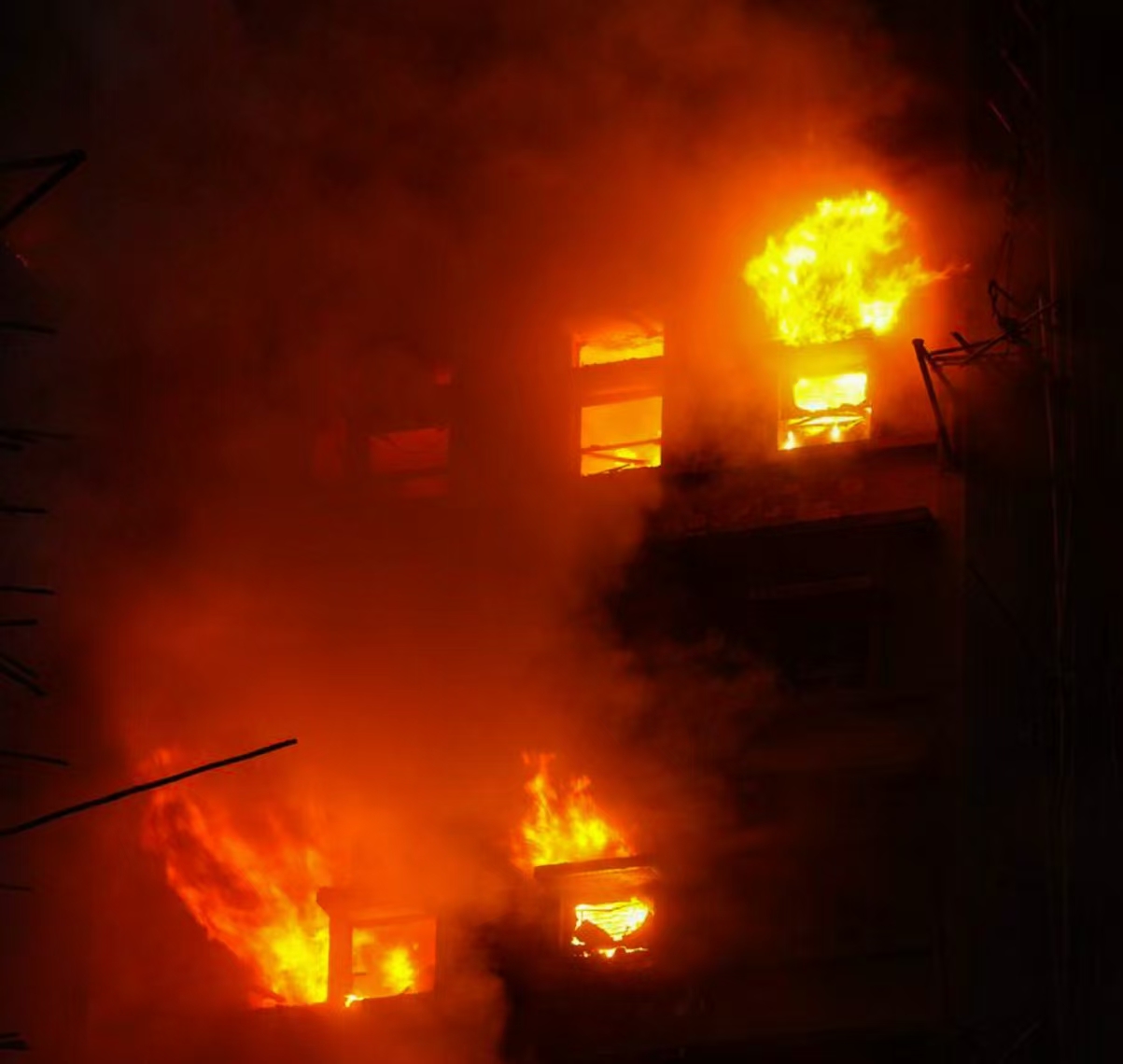 根据总台记者在火灾现场的观察,目前多栋住宅楼的火势较早前明显受控。虽然还有明火,但空中弥漫的烟雾有所减少。