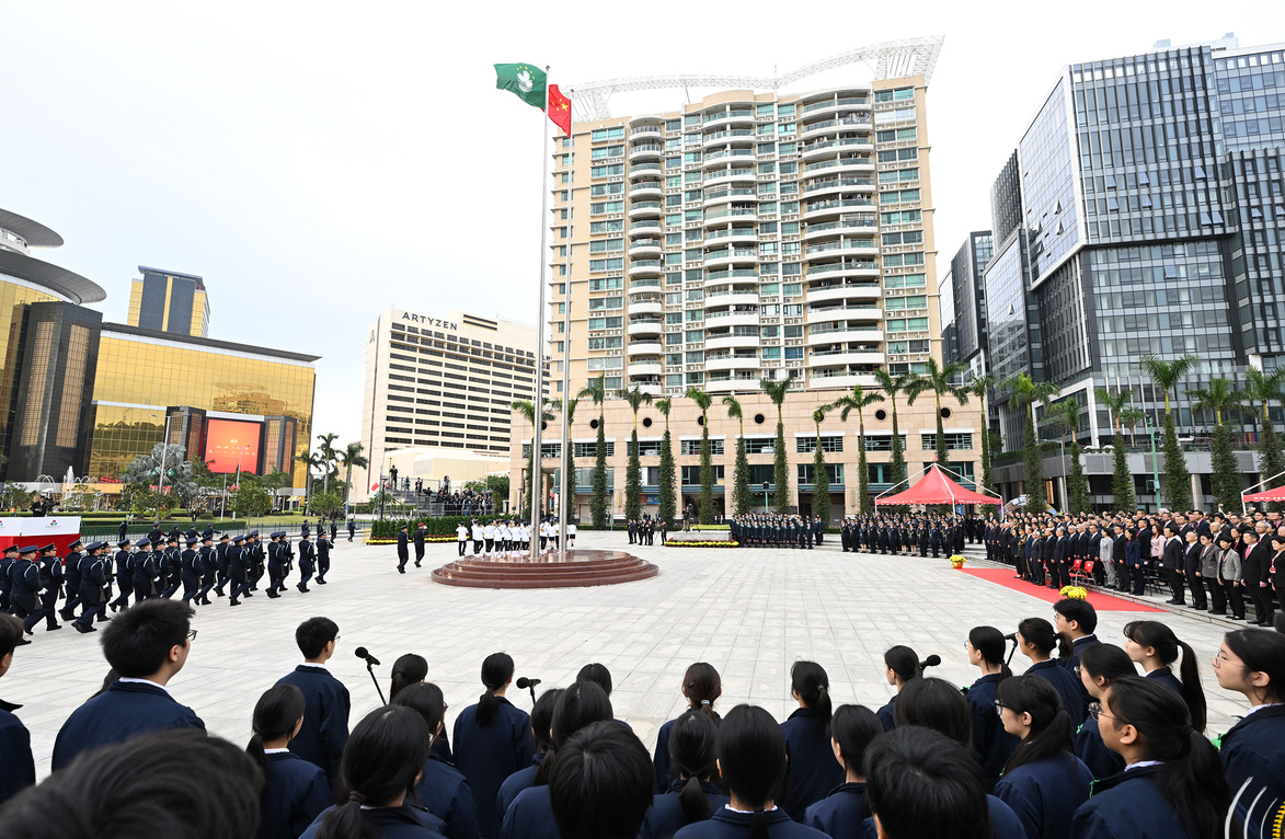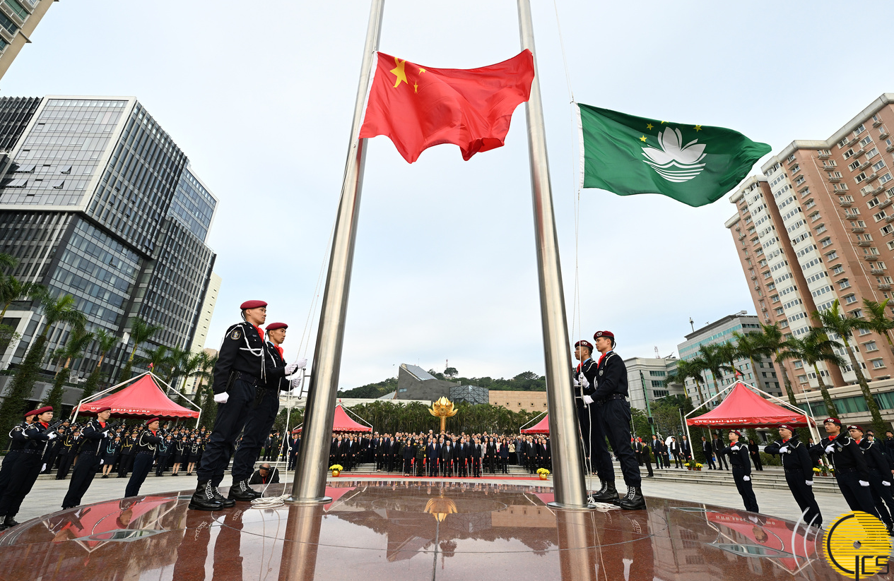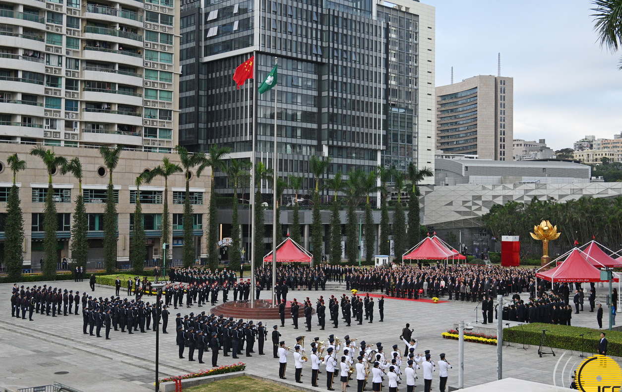 特区政府在金莲花广场举行升旗仪式,庆祝中华人民共和国澳门特别行政区成立26周年及招待酒会