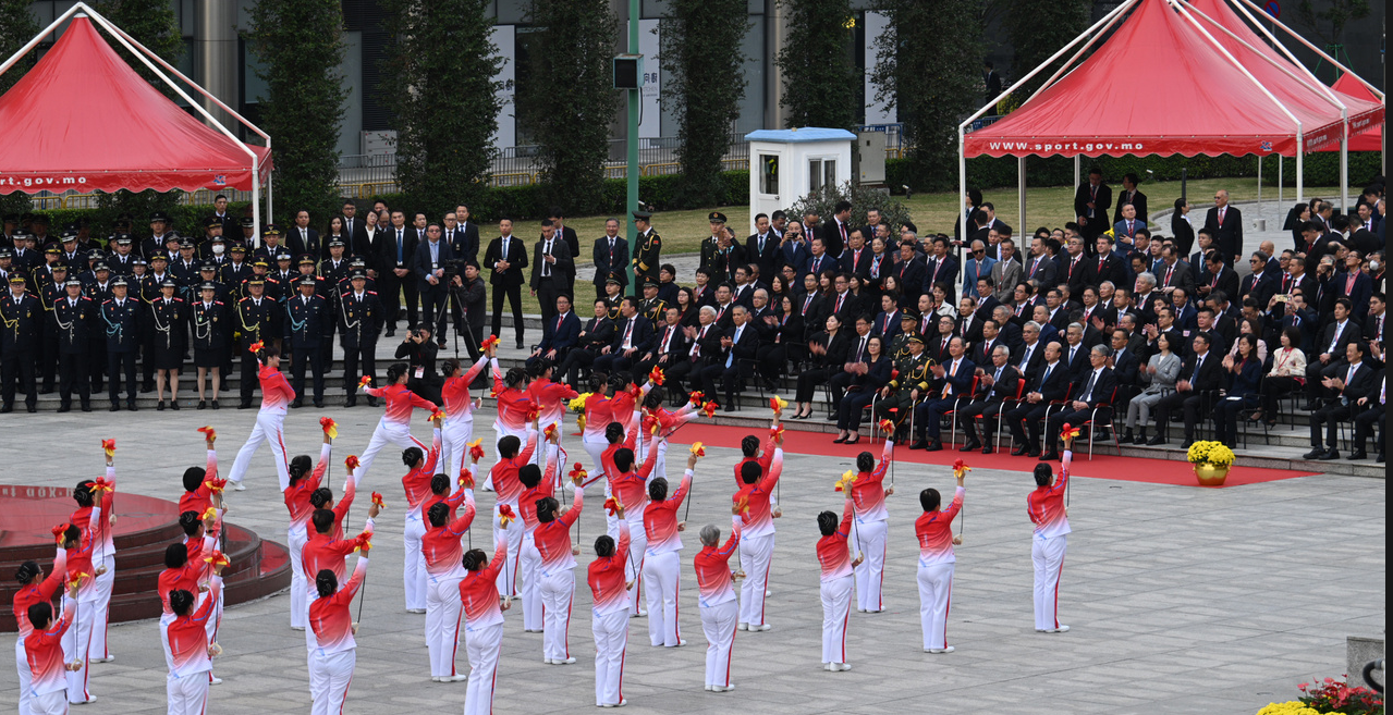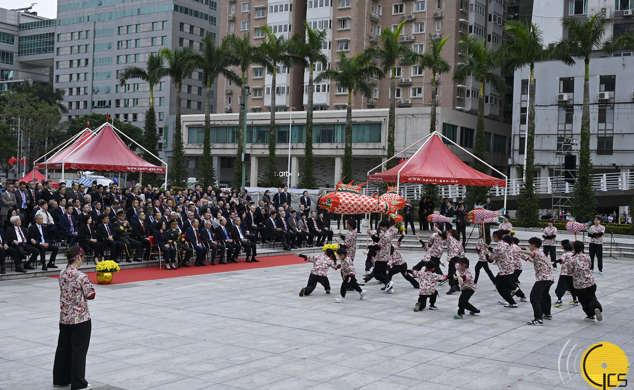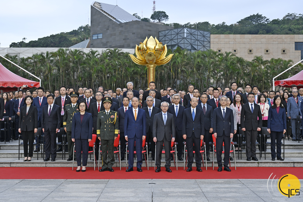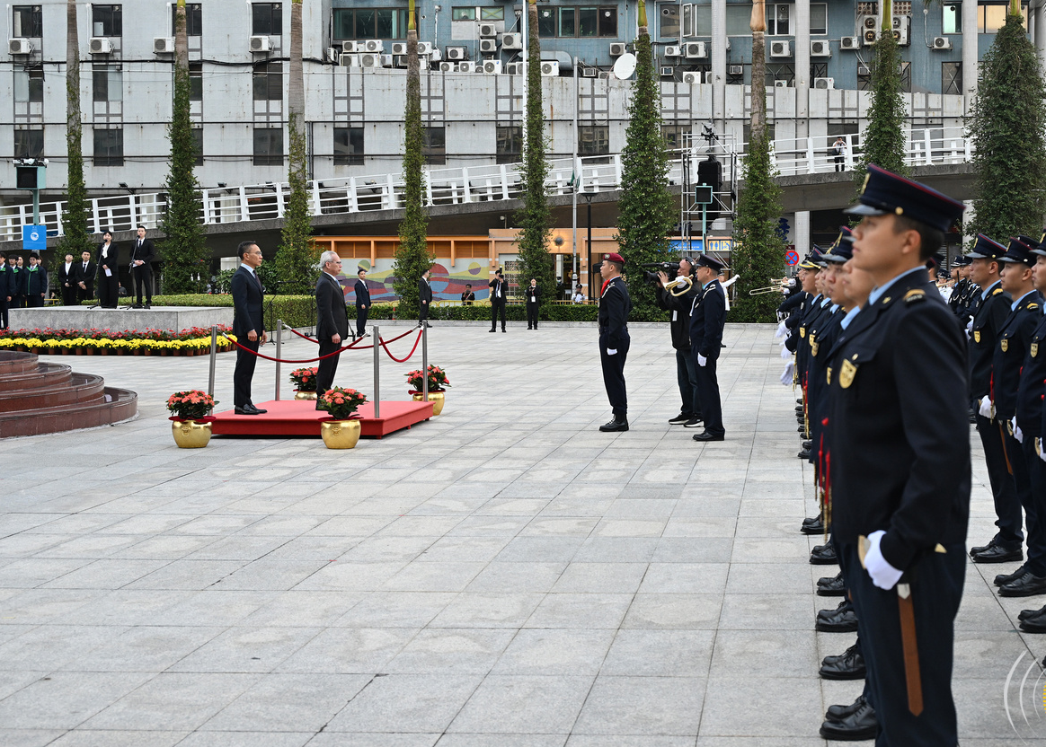 特区政府在金莲花广场举行升旗仪式,庆祝中华人民共和国澳门特别行政区成立26周年及招待酒会