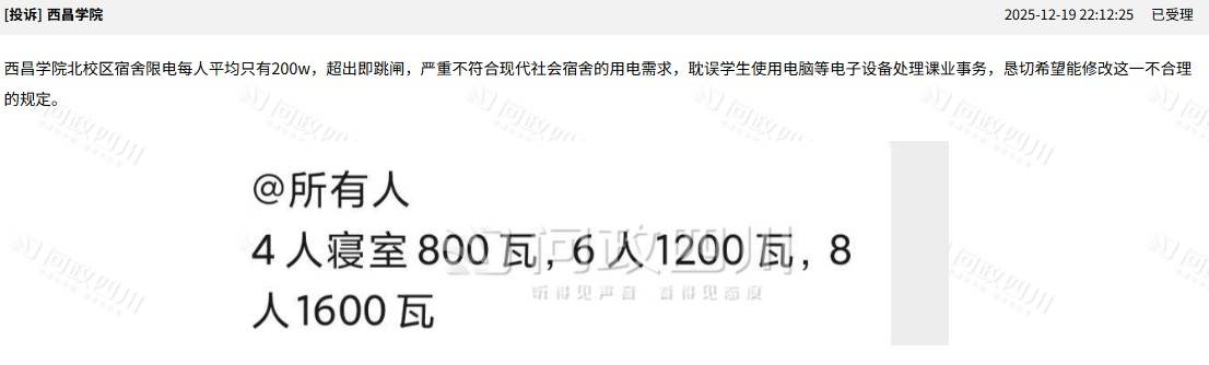 涉事学校是西昌学院,是一所公办本科院校。网友发布的聊天截图显示,学校让同学们不要用大功率电器,设置了该标准,超过会跳闸。学生表示,该标准导致频繁断电,影响学习生活。