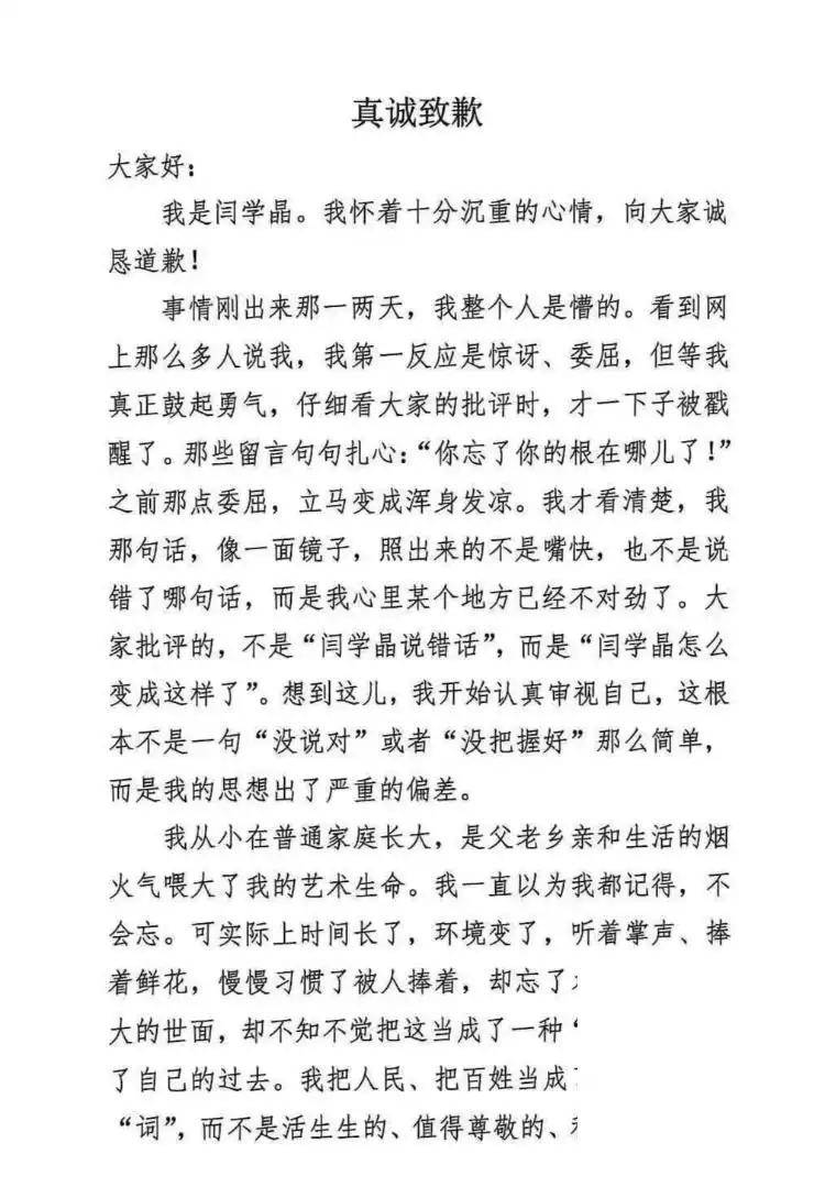 可以说,闫学晶的这份道歉声明,可能未能触及到核心问题,反而加剧了公众的不满和质疑,给她的形象和口碑带来了更大的负面影响,也让她的事业发展蒙上了一层阴影。