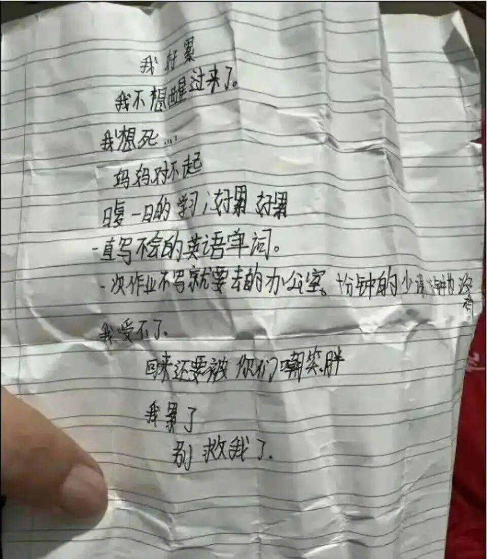 回顾事件:2024年9月23日,六年级女生小许因肠胃炎请假在家,吞服近百颗外婆的心脏病药物轻生,抢救无效离世。她的遗书字迹稚嫩却字字沉重:“我好累,不想醒过来了,妈妈对不起。日复一日的学习好累,不会写的英语单词、没尽头的作业,回来还要被你们嘲笑我胖,我累了,别救我。”