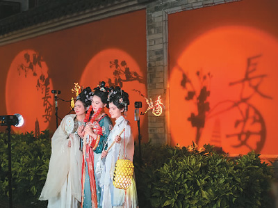 在西安大唐不夜城景区,身着汉唐服饰的游客在拍照。翁奇羽摄(人民图片)