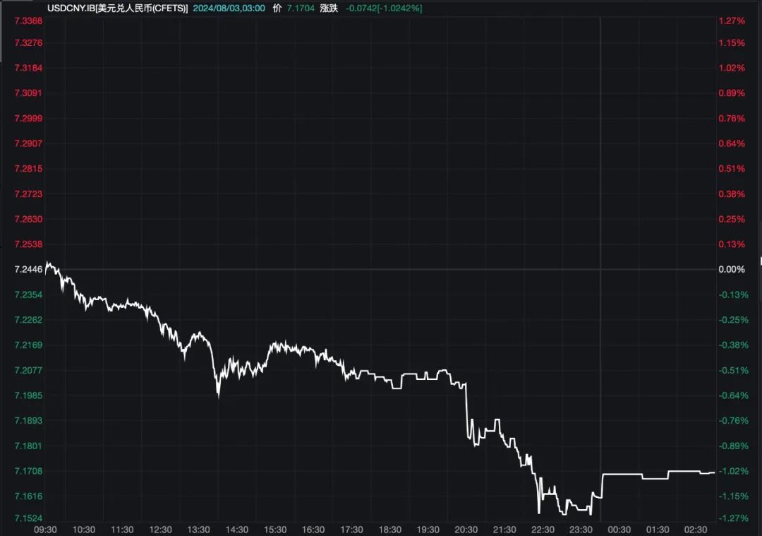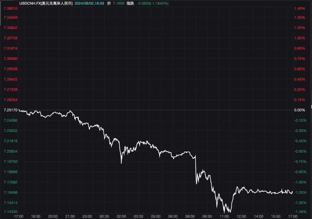 Wind数据显示,8月2日,在岸人民币对美元汇率16时30分收盘价为7.2150元,较上一交易日涨296个基点,盘中最高报7.1524元,最大涨幅超900基点。离岸人民币对美元汇率当日收盘报7.1658元,较上一交易日涨859个基点,盘中最高报7.1433元,最大涨幅超1000基点。